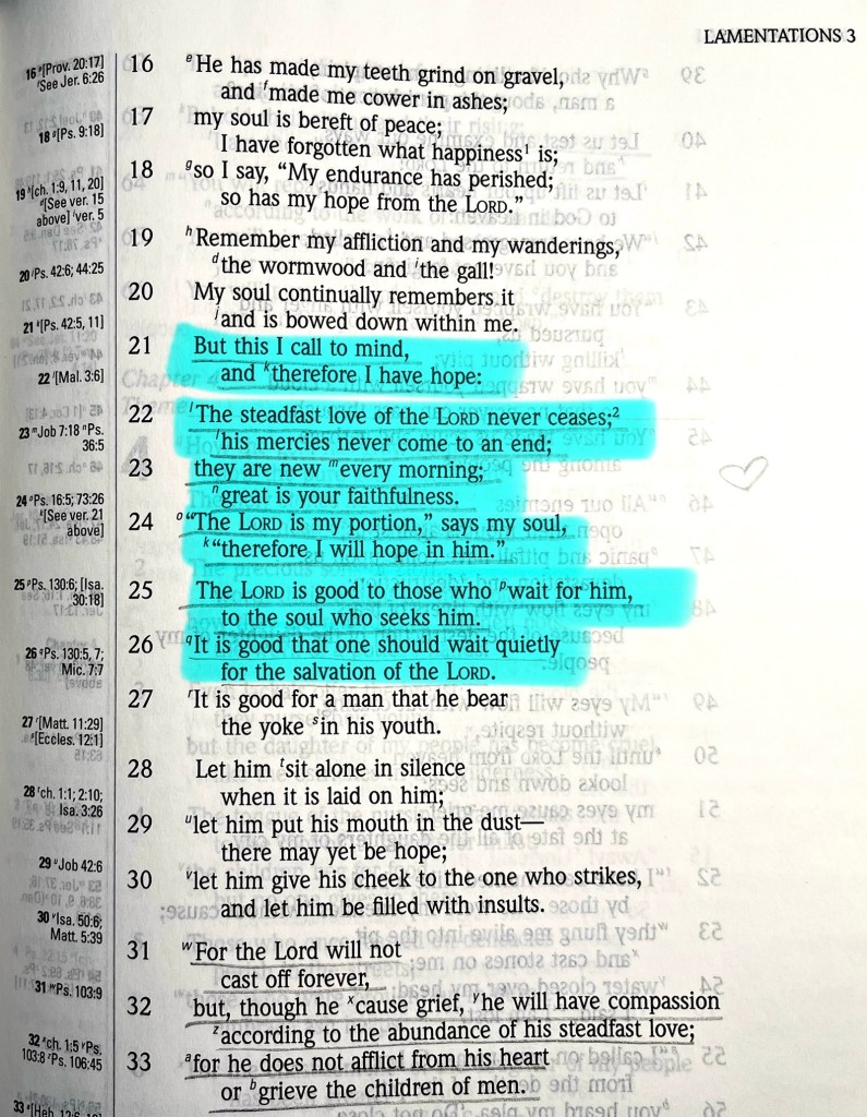 God is not surprised by any of this. It’s not new to Him. And He doesn’t get tired, He doesn’t stop loving us despite our epic and repeated and widespread failures, He doesn’t run out of mercy. (Lamentations 3:21-26)