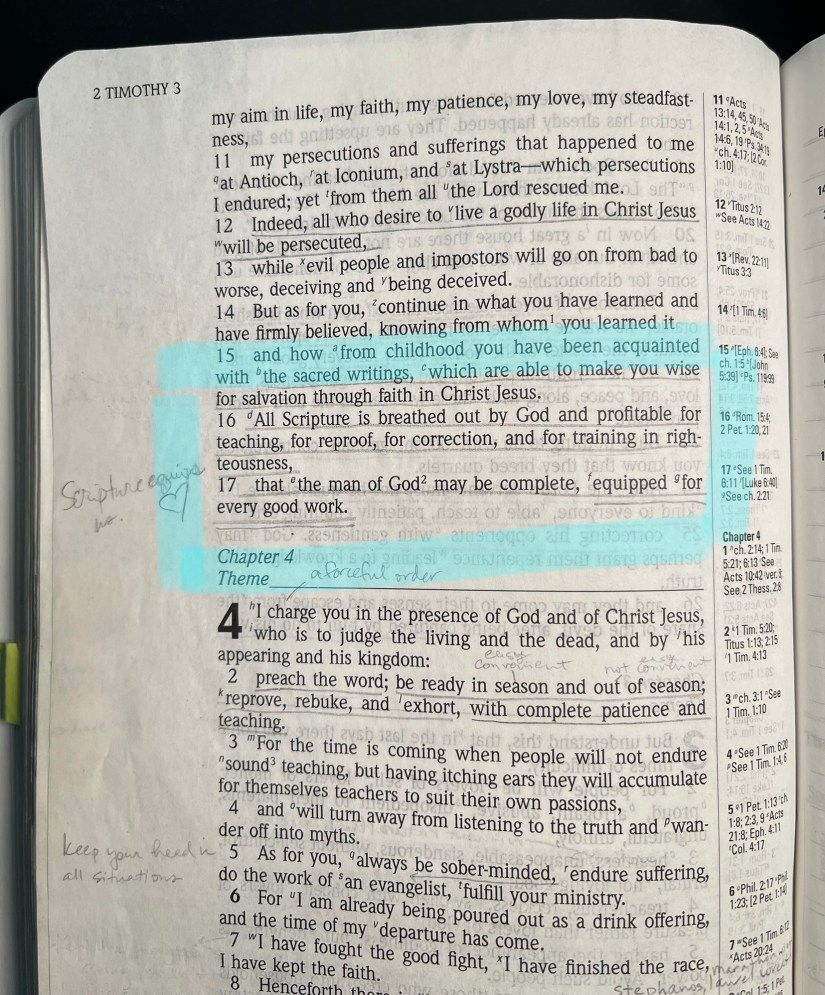 (2 Timothy 3:16-17 ESV) This tells us that He has provided all we need to learn truth, to see where we’re wrong, to understand what’s right, and to practice righteousness in our daily lives. He has provided all we need to be complete, to be equipped for every good work. And it’s all found in Scripture.