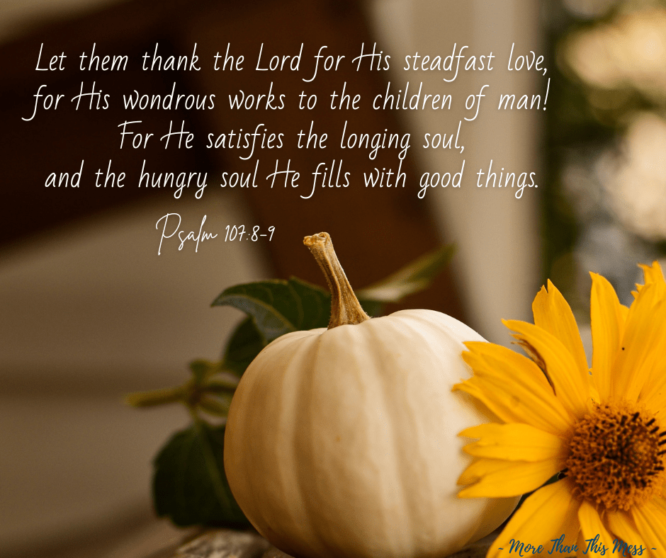 Whether you are enjoying every moment of this Thanksgiving season and finding it easy to list a million things you’re thankful for, or you’re chest-deep slogging through the muck of difficult times, or you’re anywhere in between, take a moment to remind yourself of the most important thing – the thing that means there is real hope, there is light ahead, there is everlasting goodness in store for you if you have put your trust in Jesus Christ: our good God satisfies the longing soul, and fills the hungry soul with good things. His promises are true, and His love for you is steadfast, never changing, and never, ever, ending.