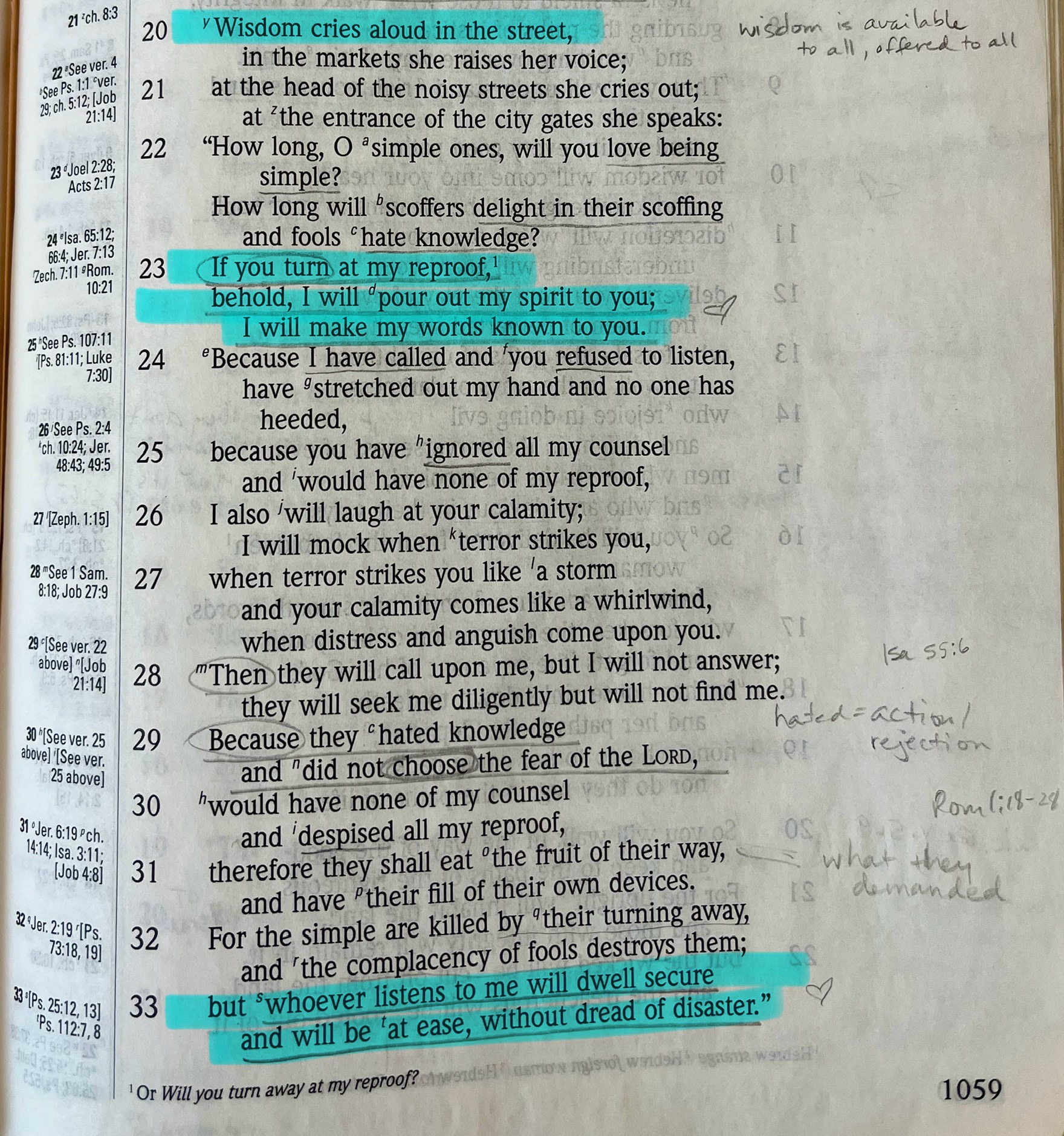 It means that even *through* the hard things, even through the *hardest* things, we can have peace. We can dwell secure, even when the storms rage around us. We can be at ease, even when the worst threatens. We can have true peace, with no dread, even when disaster looms — because we know Who holds us. We know His promises for all of eternity. We know enough about Him and about what is to come — pleasures forevermore at His right hand (Ps 16:11), no more tears or death or pain or sorrow (Rev 21:3-4) — that we have full assurance that One Day, all the wrong will be abolished, and only Good will remain. One Day, all will be made right for all those who have truly listened to Wisdom, who have turned from their sin to Jesus and been adopted through faith into the family of our good God.